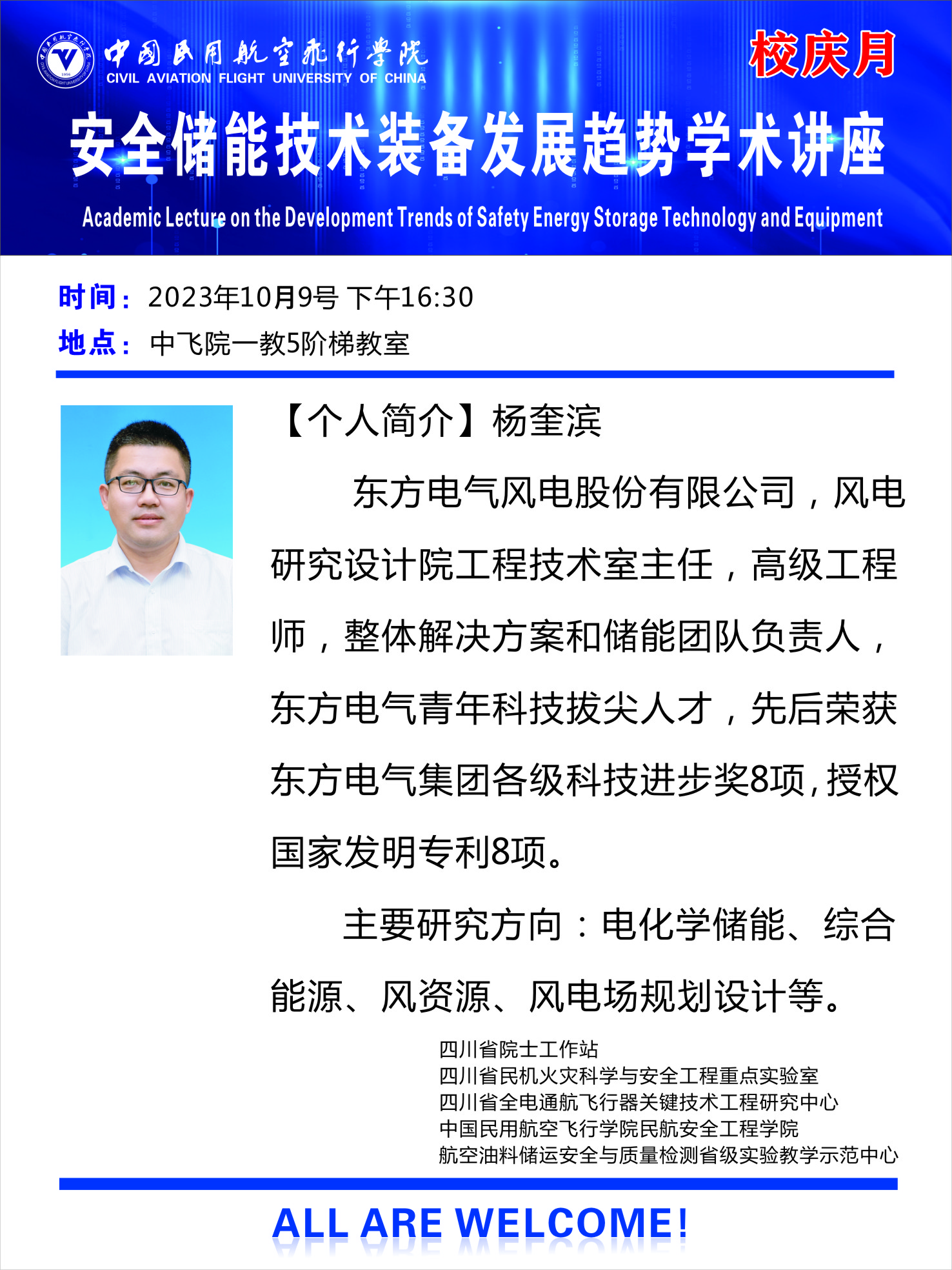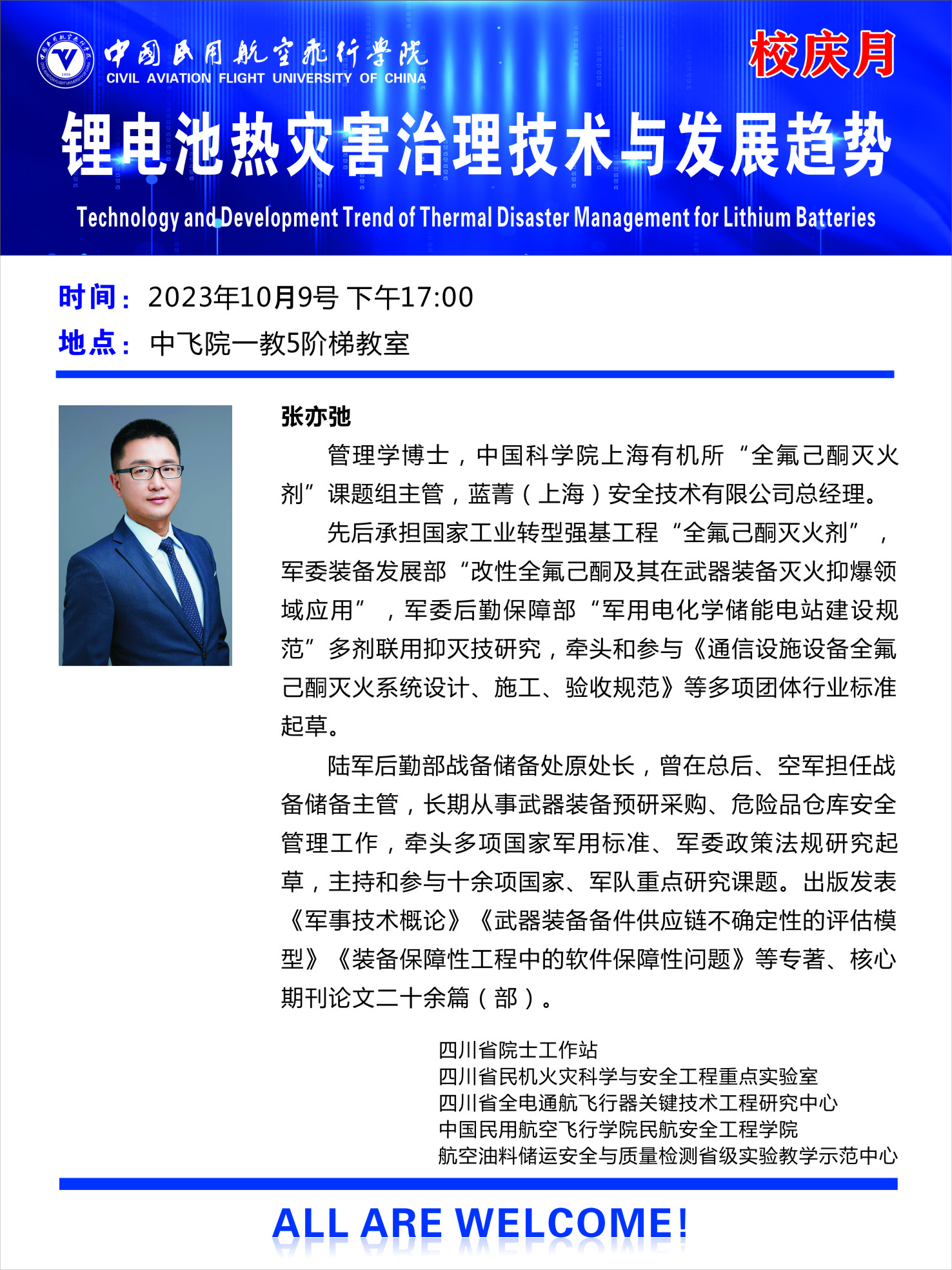 2023年10月9日、10日,为营造良好的科研和学术氛围,庆祝中飞院建院67周年,扩大我校在行业内的科研影响力、提高我校师生的科研素养,安工院特邀请教育部“长江学者”、清华大学“百人引进”特聘教授张辉、蓝菁(上海)安全技术有限公司总经理张亦弛、东方电气风电股份有限公司高级工程师杨奎滨,来KY官网开展专家主题学术讲座。KY开元集团官网入口院长贺元骅、副院长何强、教师代表、全体研究生和本科生代表参加了讲座。本次讲座由KY开元集团官网入口、民机火灾科学与安全工程四川省重点实验室、四川省第十批院士工作站、中国科协学风传承示范基地、四川省全电通航飞行器关键技术工程研究中心等单位共同承办。