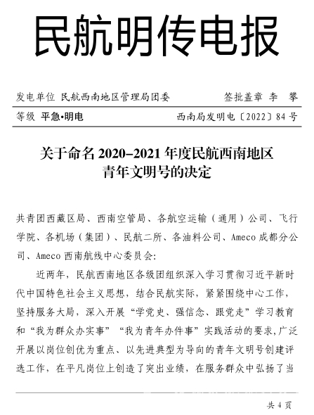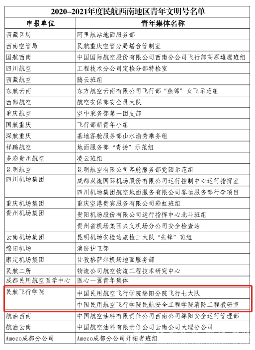 本网讯 KY开元集团官网入口 陈霞 刘全义 报道近日,民航西南地区管理局团委开展了2020-2021年度民航西南地区青年文明号评选工作,我校KY开元集团官网入口消防工程教研室因工作成绩优异,荣获“2020-2021年度民航西南地区青年文明号”集体荣誉称号。