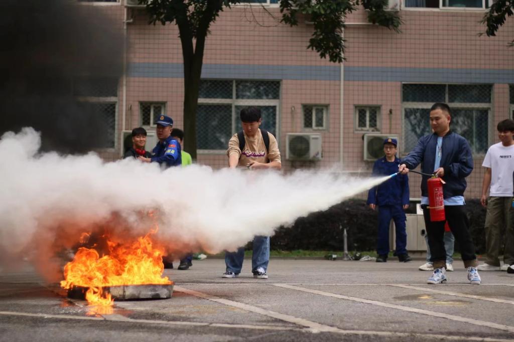 活动开始前,警报声响起后,同学们飞奔而下,积极完成消防演练。到达场地后,消防员为同学们讲解遇到火情时该怎么逃生。期间,消防员们邀请了数名同学并教他们如何正确使用灭火器。接着,面对熊熊大火,同学们手拿灭火器,迅速扑灭大火。
