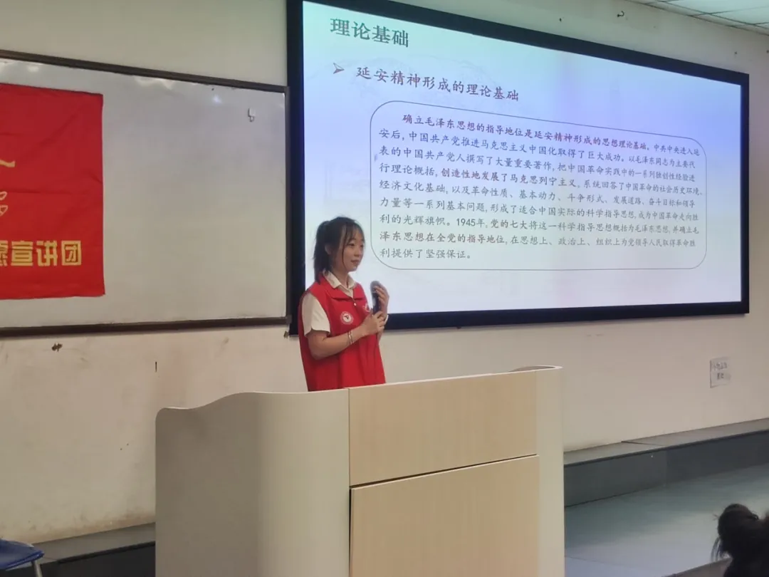 宣讲活动分别由团队成员夏芷若、张子轩、李娇蓉主讲,为参会学生介绍了延安精神的形成背景,通过介绍延安精神背后的故事,让大家深刻感受到前人不屈不挠、艰苦奋斗的精神品质。从不同角度、不同层面深入解读了延安精神的丰富内涵和时代价值,让同学们深刻感受到中国共产党人的坚定信念和崇高精神追求。在宣讲过程中,还鼓励同学们要传承和发扬延安精神,坚定正确的政治方向,用延安精神滋养初心、淬炼灵魂,勇于面对困难和挑战。