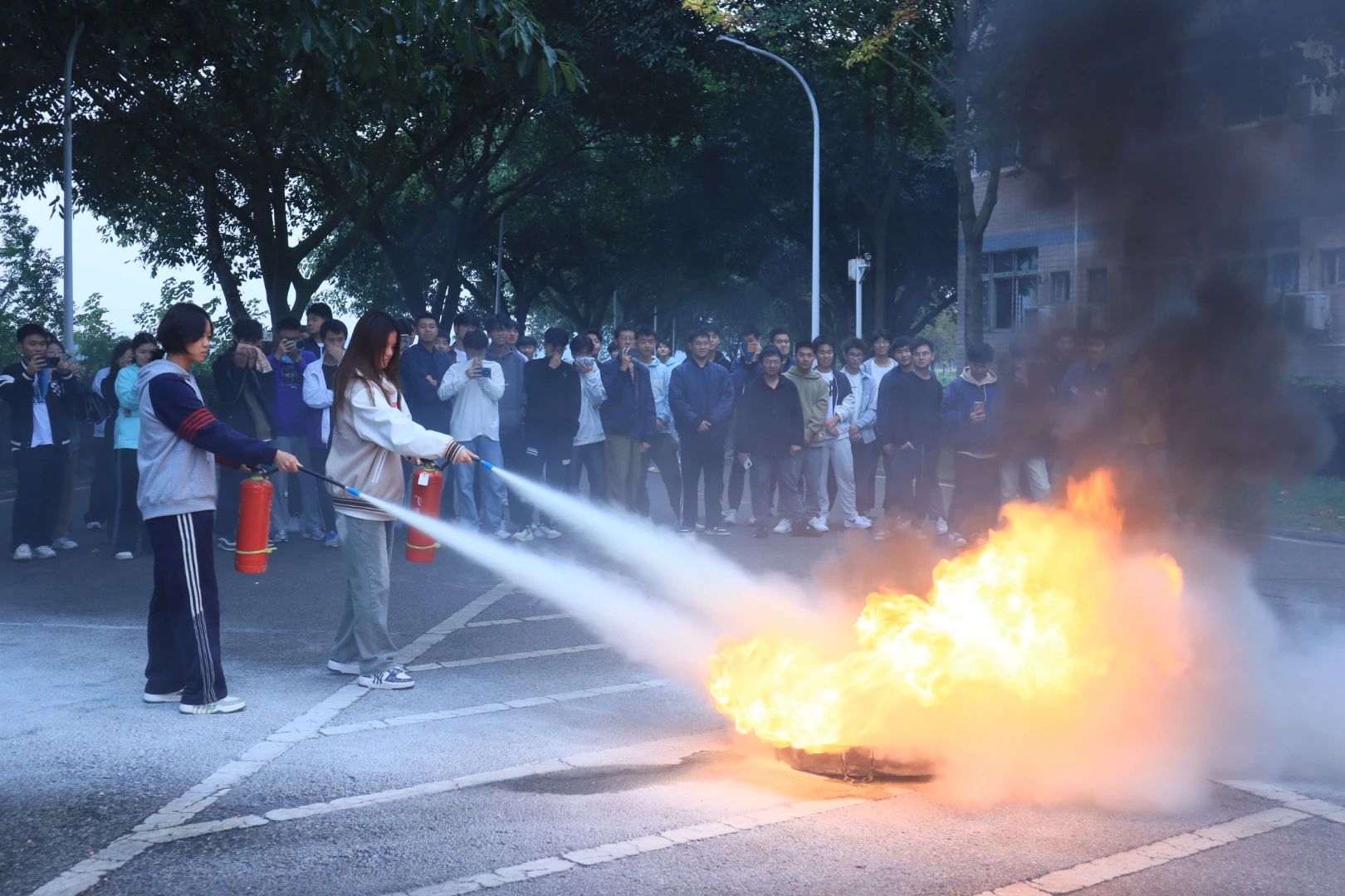 应急疏散完成后,灭火演示环节成为了大家关注的焦点。校公安局消防支队教官向同学们详细介绍了灭火器的适用范围和使用方法,并且针对常见的火灾类型进行了演示。灭火器在消防人员手中就像一件精准的武器,对准火焰根部,一喷即灭。