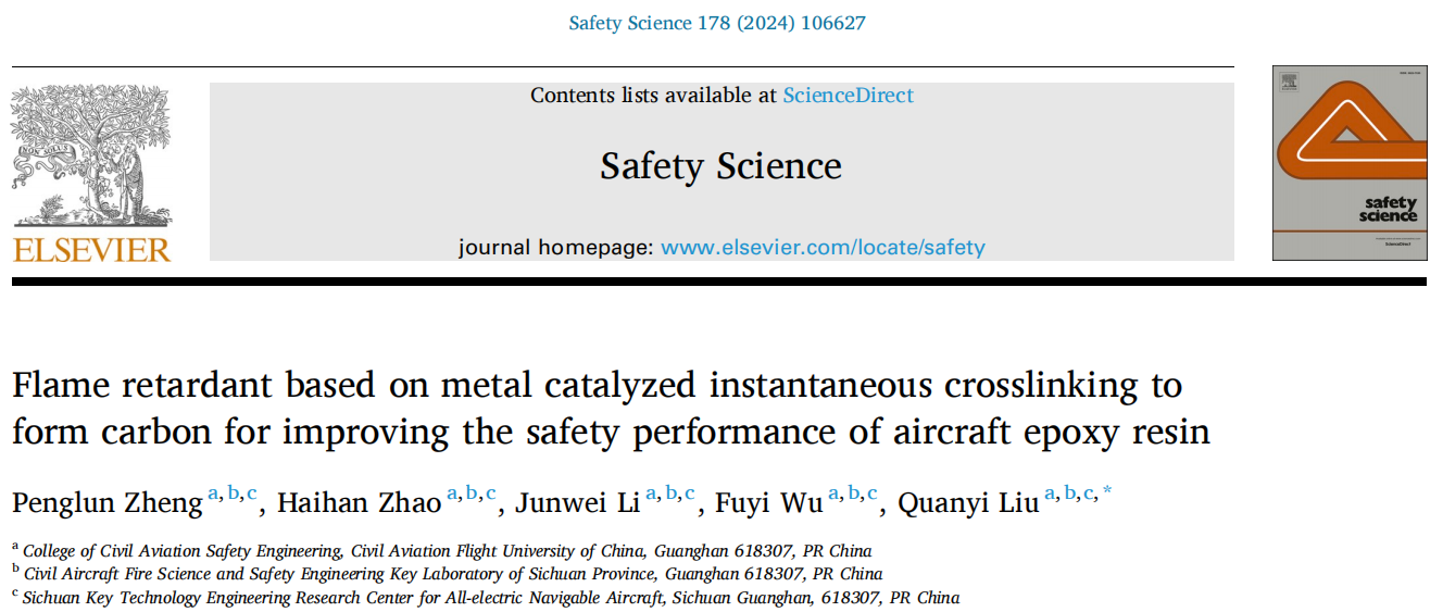KY开元集团官网入口刘全义教授团队在安全类TOP国际期刊《Safety Science》上发表论文“Flame retardant based on metal catalyzed instantaneous crosslinking to form carbon for improving the safety performance of aircraft epoxy resin”。该期刊系SCI检索期刊,中科院1区TOP期刊,JCR 1区,最新影响因子6.1。该期刊旨在发表安全管理、风险评估、事故分析、安全文化、安全技术等安全科学领域的原创研究。论文的第一作者为郑鹏伦副教授和在校研究生赵海涵同学,刘全义教授为论文的通讯作者。该成果得到了国家自然科学基金(U2033206)和民机火灾科学与安全工程四川省重点实验室基金(MZ2022JB01)的支持。