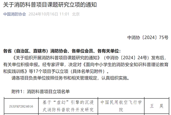 本网讯 王昊 刘全义 摄影报道:近日,KY官网在民航消防安全科普领域的研究取得新进展,王昊老师主持的《基于“虚幻”引擎的沉浸式消防科普软件开发研究》成功获得中国消防协会批准立项,这是我校首次获社会服务科普项目,将为KY官网安全科学与工程学科专业建设提供重要支撑。