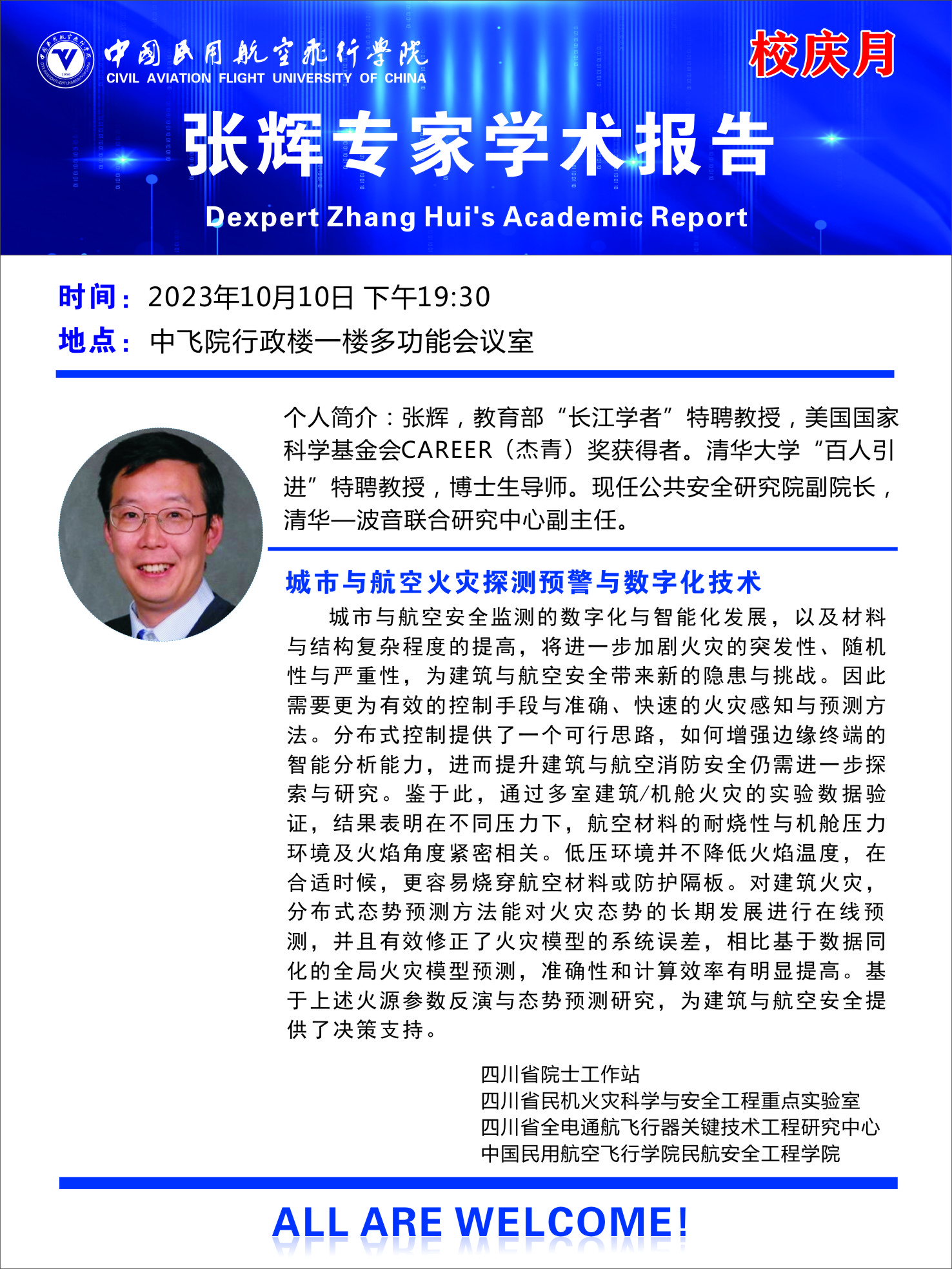 (2)10月10日19:30,中飞院行政楼一楼多功能会议室,清华大学张辉专家--城市与航空火灾探测预警与数字化技术学术讲座。