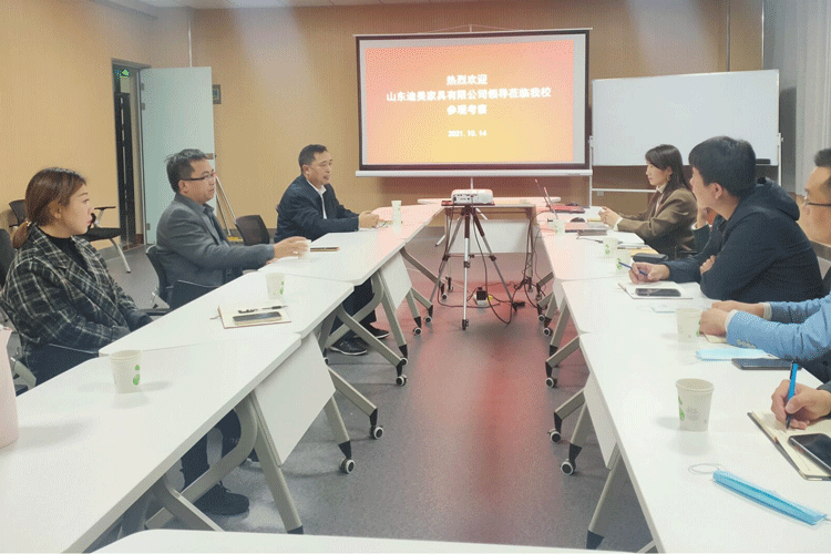 10月14日,山东华宇工学院kaiyun体育网页登录入口李海龙院长、产品设计教研室胡建华主任、贺莹副主任接待了山东迪美家具有限公司杨坤总经理一行五人考察团,双方就产品设计专业与山东迪美家具有限公司建立产教融合、实践基地等事项进行了坦诚而友好的交流。