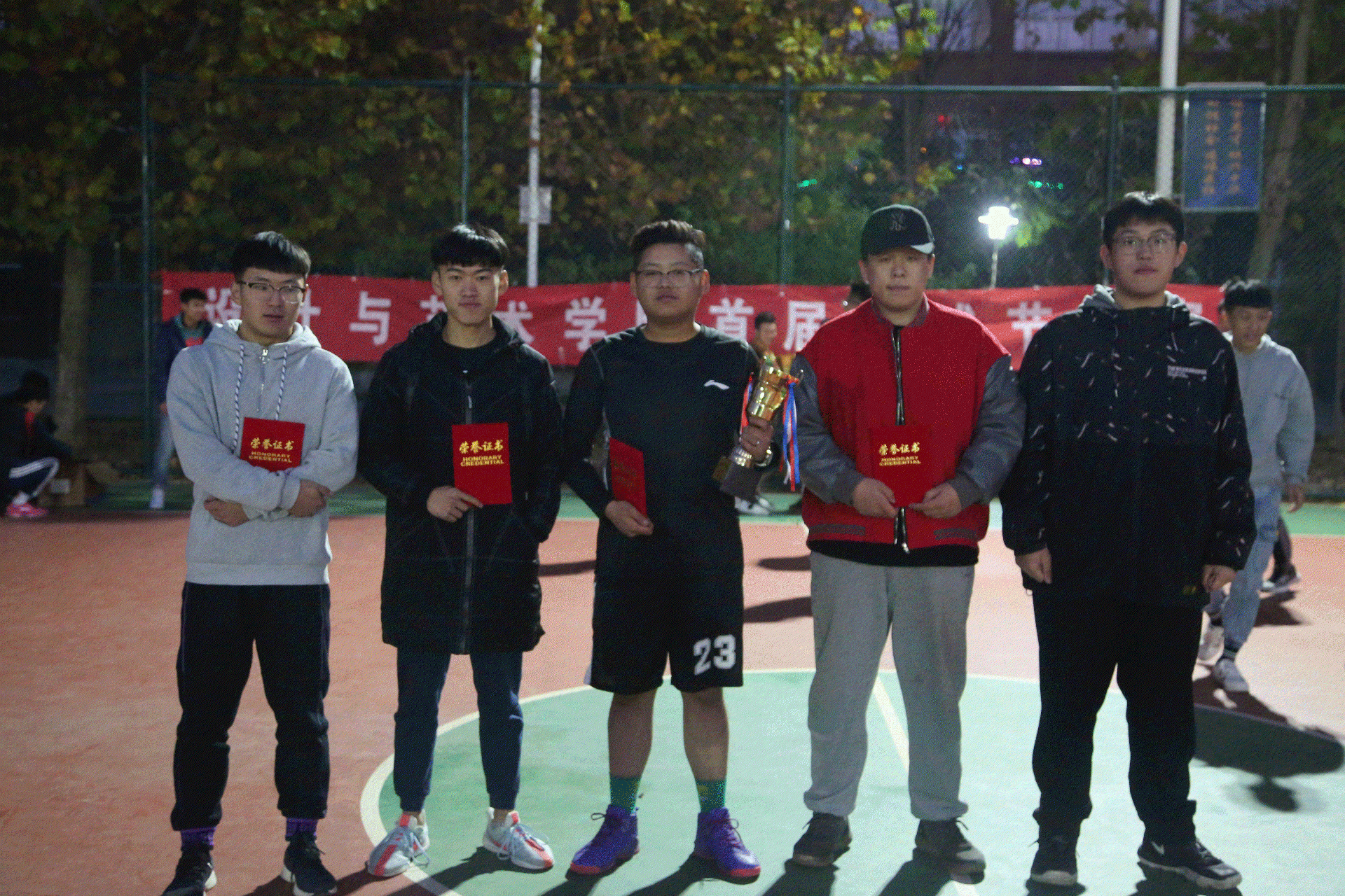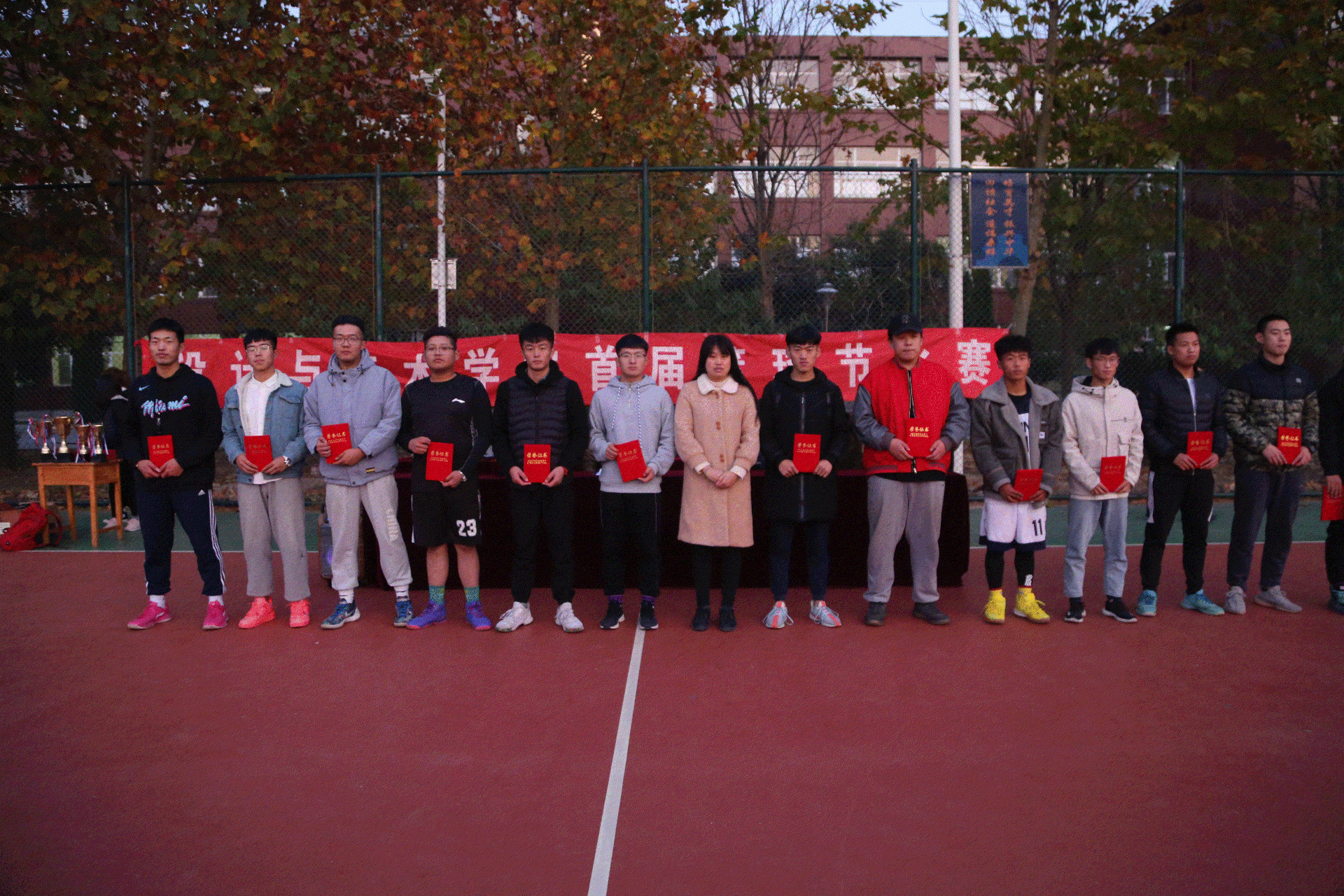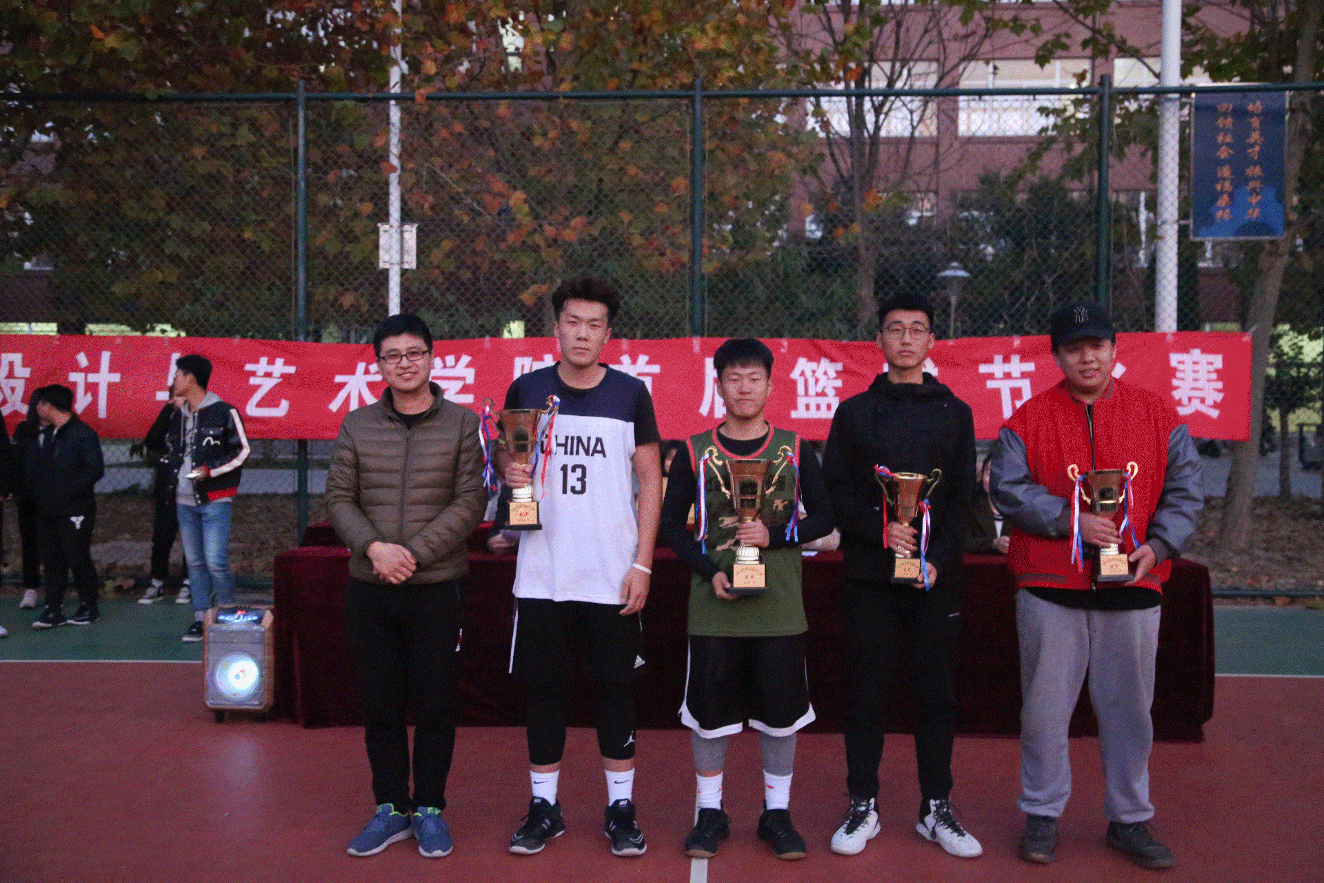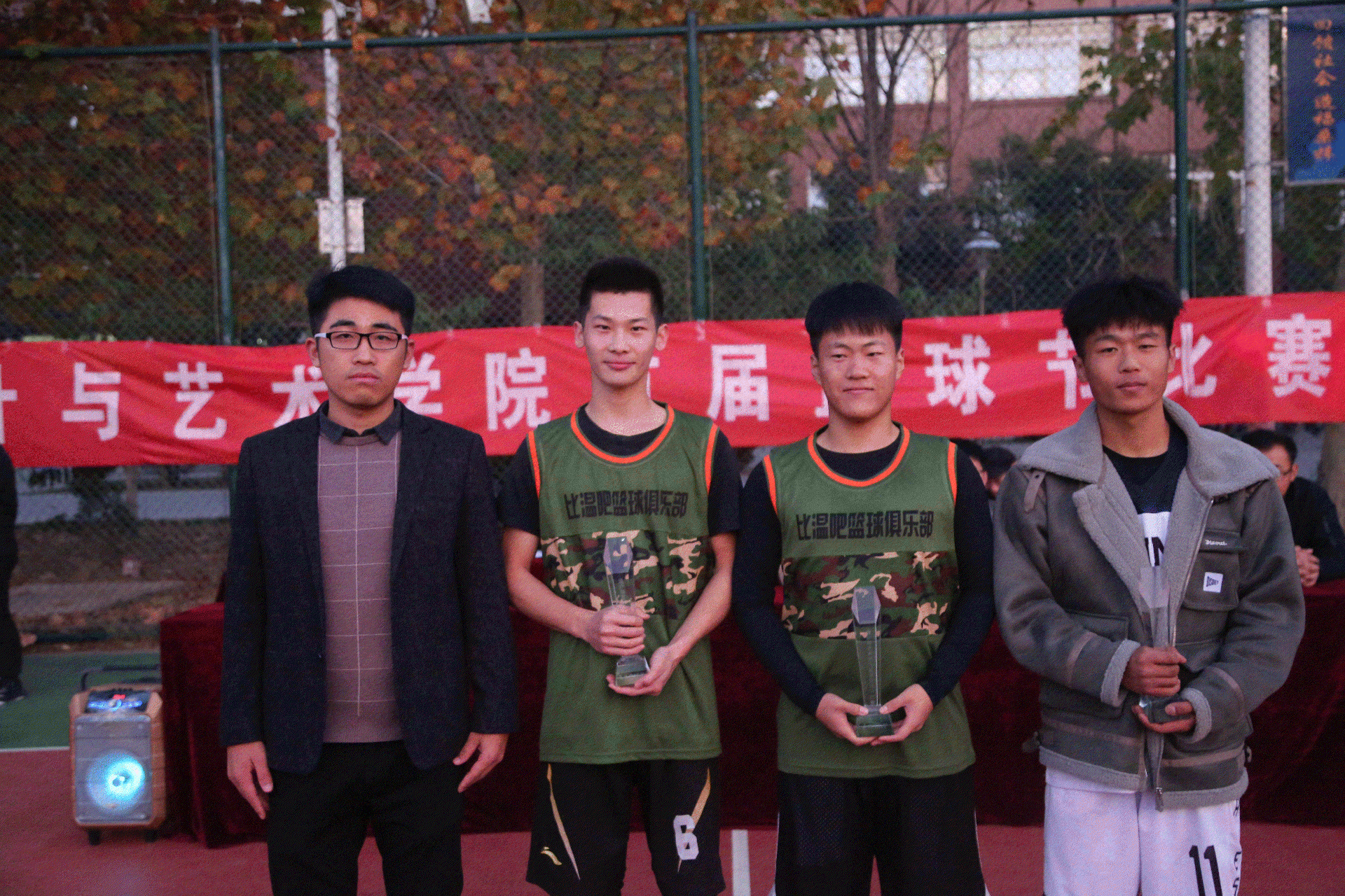 首先,由学生科长郑帅宣读本届篮球赛获奖名单,郑科长肯定了各班级代表队的优异成绩,并勉励其他代表队学习其敢打敢拼、不畏艰难的精神;其次,由霍靖靖老师和甄玉良老师分别为17位裁判员以及三位MVP获得者:16数字媒体技术3班王尚瑞、16数字媒体技术3班赵其旋和17视觉传播设计与制作2班李俊科颁发证书和奖杯;最后,由学生科长郑帅为冠军得主16数字媒体技术3班、亚军得主17视觉传播设计与制作2班、季军得主18数字媒体技术3班、殿军得主18视觉传播设计与制作3班的班级代表队颁发奖杯并合影留念。
