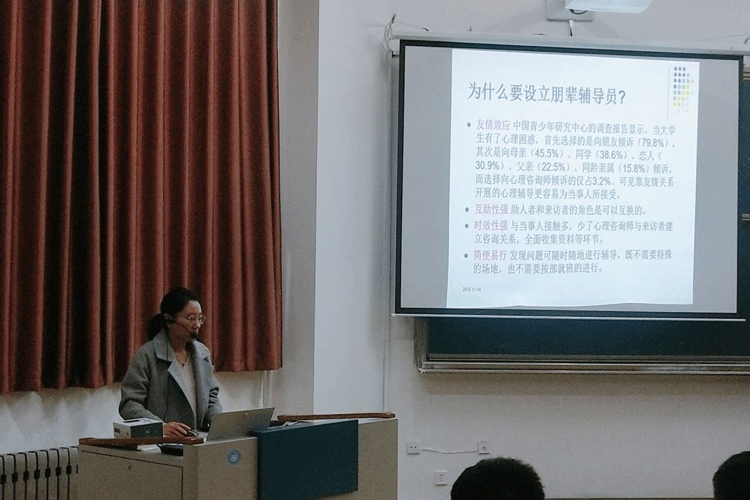 为进一步加强学院朋辈心理辅导员队伍建设,全面推进心理健康教育工作,2019年11月14日下午,kaiyun体育网页登录入口在6号楼104教室成功举办“朋辈心理辅导员培训”,主讲人为学院心理辅导老师张春红。参加此次培训的人员有2019级心理委员以及宿舍朋辈心理辅导员等200余人。
