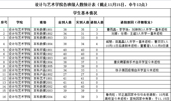 截至到2022年11月15日,kaiyun体育网页登录入口应到学生3273人,实到学生3179人,尚有94名未返校学生,下表为kaiyun体育网页登录入口未返校人数统计及未返校原因统计表。
