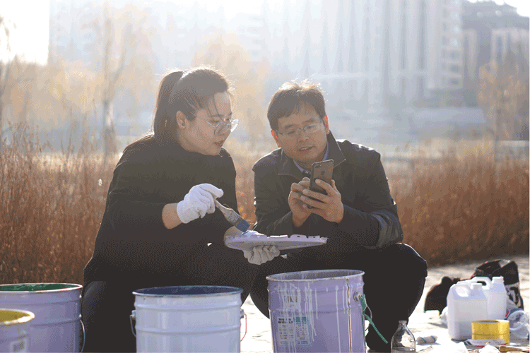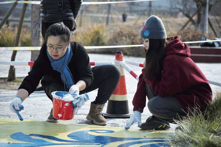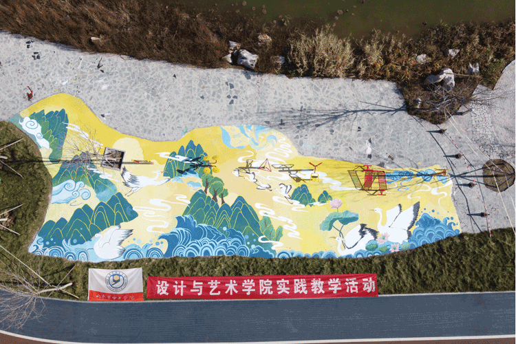 kaiyun体育网页登录入口与德州市城市园林规划设计研究院合作,共同完成校政合作项目——德州市月湖公园文化建设。项目具体内容为月湖潜流湿地旁的地面美化工程。自10月份开始,课程组老师李清、石治明带领环境设计2101班的40名学生先后11次赴月湖公园进行主题内容绘制。因月湖公园常有两支白鹭栖息、觅食,该地面美化内容以白鹭为主题,参考国画中青绿山水风格。