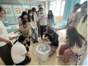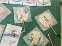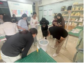 本次活动由学院科研科长冯士荣老师主讲。活动伊始,冯老师首先向大家介绍了漆扇的发展,讲述了漆扇制作工艺、“漂漆”的技法等。冯老师对漆扇入水方式进行了示范,为同学们演示了直入法、斜入法等制作手法。随后冯老师为同学们讲解了配色的技巧,介绍了传统的配色体系。通过前期的理论学习,同学们十分热情,现场气氛热烈。活动期间。科普讲解老师分别开始实操展示及安全注意事项讲解,同学们就近进行学习与提问,随后开始实践操作。