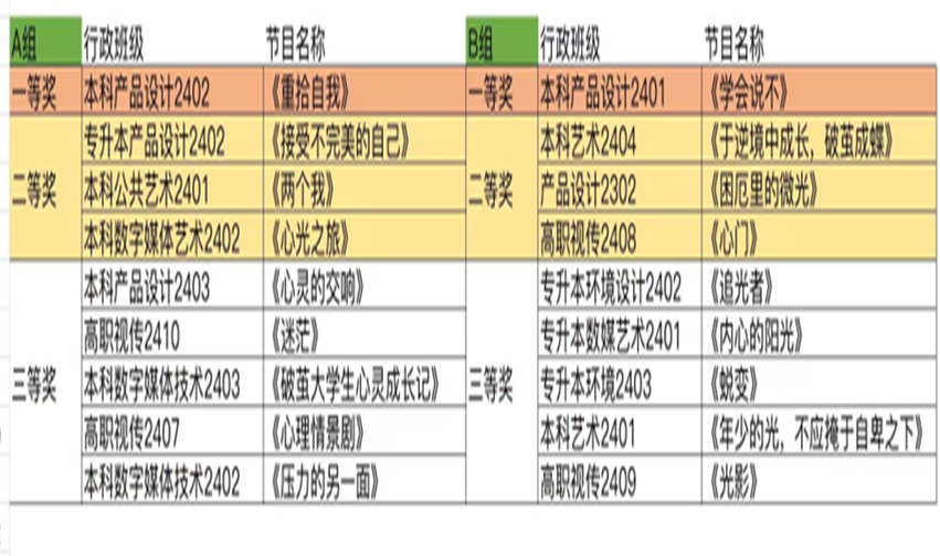 本次活动吸引了众多kaiyun体育网页登录入口学生的积极参与,共收到来自不同年级、不同专业的多部原创心理情景剧作品。评委老师,对剧本的创作和表演提供专业的点评和建议,最终有18部作品脱颖而出,三等奖10部、二等奖6部、本科产品设计2402《重拾自我》和本科产品设计2401的作品《学会说不》荣获本届心理情景剧活动一等奖。