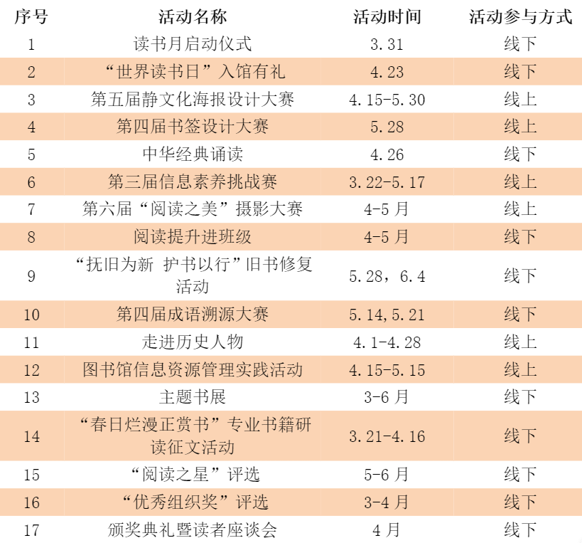 本届读书月活动将组织“第五届静文化海报设计大赛”、“第四届书签设计大赛”、“第三届信息素养挑战赛”、“中华经典诵读”等17项读书活动,各项活动根据参与学生人数分别设立奖项,充分为学生成长发展搭建平台,提供舞台,不断丰富学生的校园文化生活。